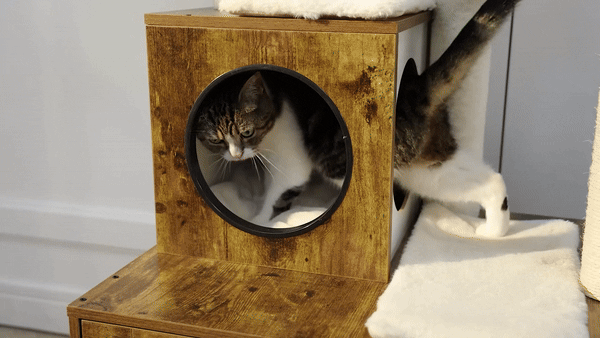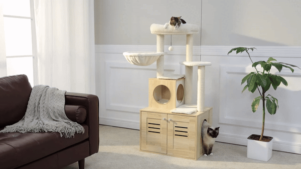 My old buddy, who's a bit on the hefty side, absolutely adores his new cat tree. He’s always snoozing on the very top, so I'm relieved it's solid enough to hold him! Everything came well-marked for a smooth setup. The instructions were a breeze to follow, and it even included all the tools needed, plus a wall anchor for extra security. The bottom compartment is spacious enough for a litter box and comes with a waterproof liner that's removable – super handy for keeping the area clean and odor-free. And, it came with toys! One's a spare for when the first one's had too much love. There are a bunch of scratch posts and a scratch pad that sticks on with double-sided tape. The soft mats also stick on with tape, which I’m a bit iffy about... wondering how that'll hold up after washing off any messes. Putting the cat tree over the litter box is such a smart space saver and keeps the litter out of sight. All in all, I'm thrilled with this purchase. Solid 5 stars from me!