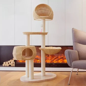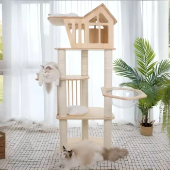 Our cat tree is more than just a piece of pet furniture; it’s a space where your cat can truly thrive. Made from high-quality solid wood, it offers unmatched durability and stability, ensuring a safe environment for your cat to explore. The sisal-covered posts provide the perfect outlet for scratching, helping to keep your cat’s claws healthy while protecting your furniture. With five layers and above, including a unique space capsule nest, this cat tree offers endless opportunities for fun and relaxation.